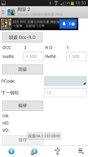 此應用程序可以幫助土地測量人員,土木工程師,透過藍牙或USB轉RS232將用戶的Android手機/平板與全站儀連接的進行地形測量。此應用程序已被優化為7英寸平板使用。