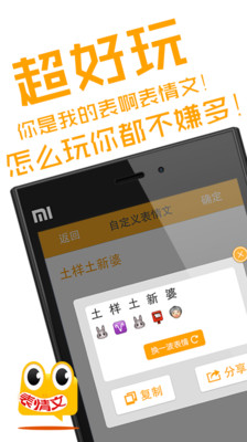 「表情文」是目前最具创意的表情类应用。你想说什么?表情文都能帮你用表情来描述!且支持发表到微信、QQ、新浪微博、腾讯微博中。