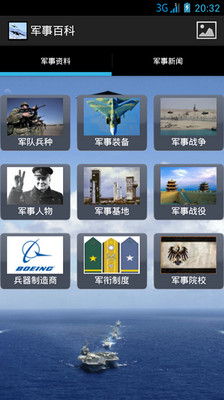此程序为军事的百科全书,里面收录了很多军事方面的信息,包括军队兵种 军事装备 军事战争 军事人物 军事基地 军事战役 兵器制造商 军衔制度 军事院校九大板块。里面还包含最新的军事新闻,让你随时随地了解军事动态!