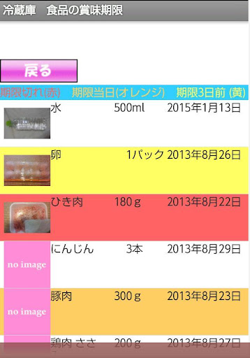 賞味期限切れ、賞味期限当日、賞味期限3日前を色分けして表示できます。