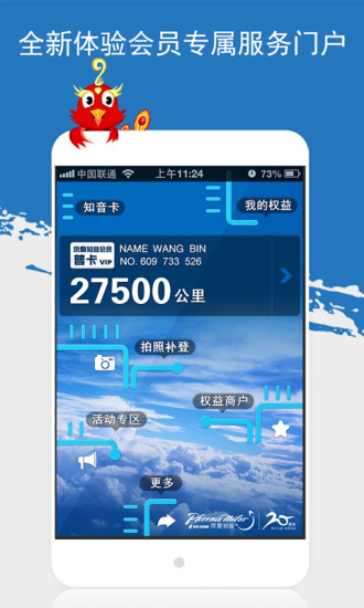 国航常旅客会员专属手机服务中心,首家推出一键拍照补登功能,随身随地查看里程明细,尽享会员特权服务。本期推出权益商户功能,请您轻松查询会员专属权益商户,消费获赠奖励里程,还有更多会员专享优惠;牵手廿载、知音有你,现在下载入会最高获赠1600里程。