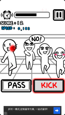 《别踢我(Don't Kick Me)》是一款十分无节操的休闲娱乐游戏,游戏的玩法非常简单,碰到红脸的人物的时候一脚踢飞他,其他人只要pass过就可以,游戏分为许多的模式,看你能不能又快又准确的来完成这款游戏呢,快来下载挑战吧!