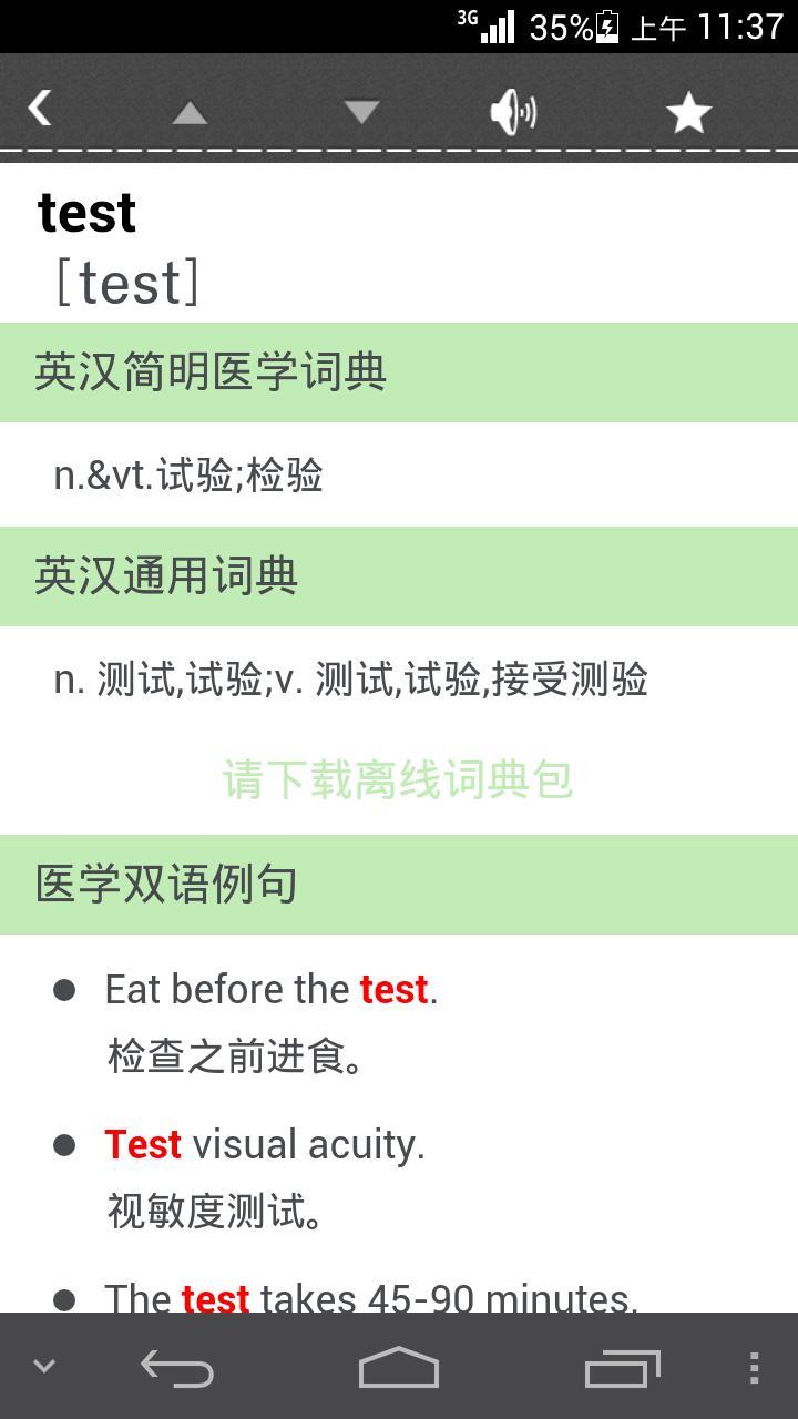 1.词汇查询:安卓版词典内置英汉简明医学词典,汉英简明医学词典,英汉通用词典和汉英通用词典共四本词典,总词汇量约300万条;可满足医学专业人员学术工作中的基本需求。