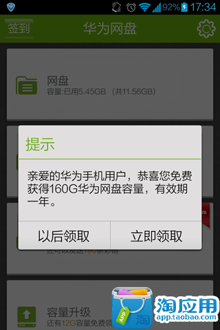 2.华为手机专享160G超大网盘:文件管理、华为网盘强强联手,实现互通,为您提供160G超大网盘空间。