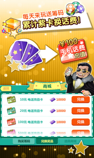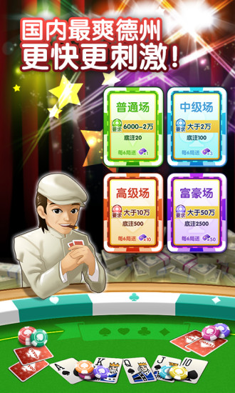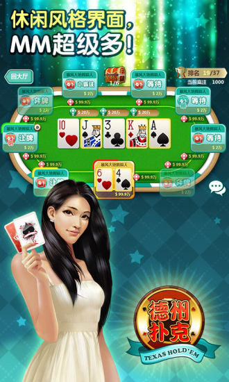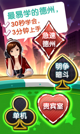 最易学最刺激的德州扑克游戏。每天来玩送筹码,累计紫卡换话费,更有国内首创的急速玩法和明争暗斗玩法。轻松精致的界面风格更适合MM玩哟!