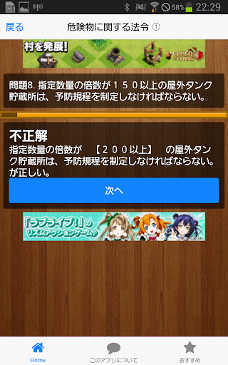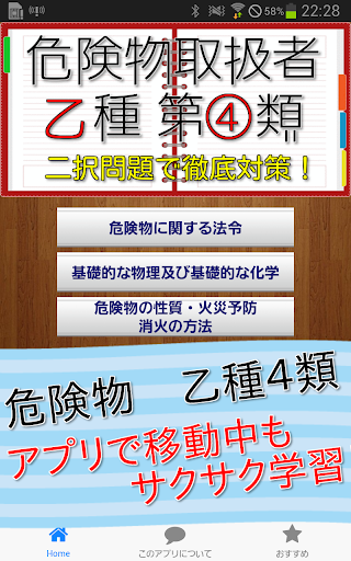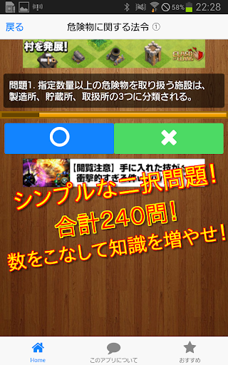 危険物取扱者 乙種4類の2択問題を解きながら学習するアプリです。