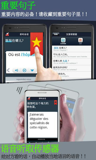 - 此应用程序包含各种类别和特定于上下文的句子,因此,您可以通过充分利用此应用程序来与其它国家/地区的人员沟通,而无需使用附加材料(词组书、字典等)。