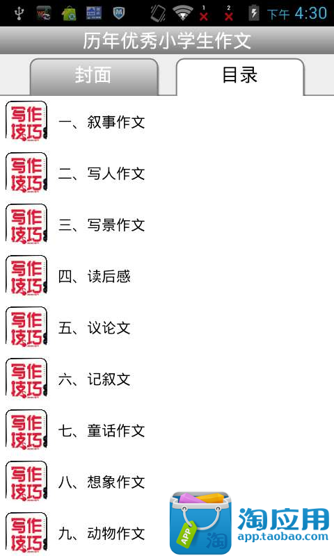 包含了全国历年小学生优秀作文,各种文体,快速提高写作技巧。大量小学生优秀作文选,包括日记周记、童话、小说、散文、诗歌、读后感、科幻故事等各种文体和作文技巧。我们保证让你,每天都要比前一天优秀一点点!