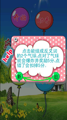 1、一款经典的气球连连看小游戏。只要找出写着反义词的两个气球,点击它们就会金花四射哦!快来挑战吧,看你能否得最高分?
