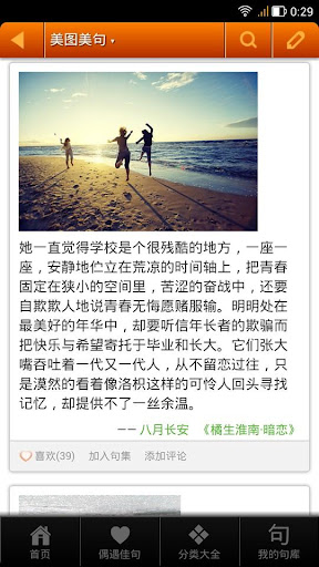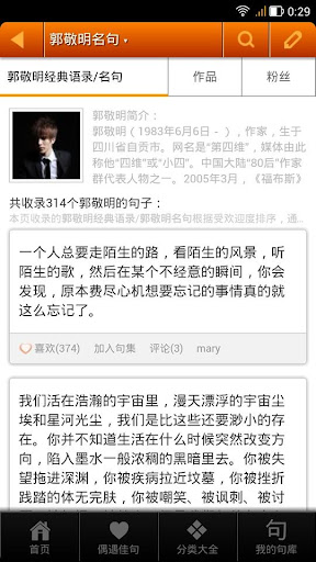句子迷是一个随身摘抄本,在这里您可以随时发布、收藏和找到您喜欢的句子,句子迷汇集众多名人名言、经典语录,是一部美句佳句大全,是一个高品质句子分享应用。