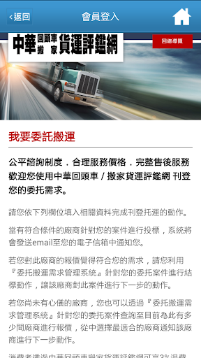 透過其平台上之中華回頭車搬家貨運評鑑網之公正公開專利正字第10340137900號之客戶回頭/搬家專利介面查詢系統,來提供業者優質的服務。