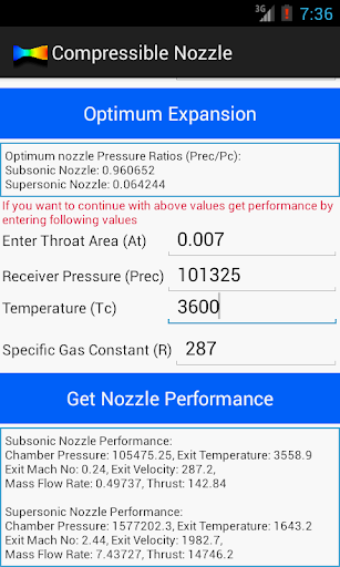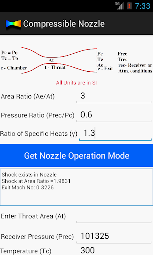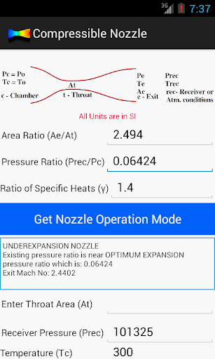 2。规定的工作条件,无论是嘴下获取的运作模式是亚音速喷嘴,正激波存在于喷嘴,冲击的位置,在膨胀或过度膨胀喷嘴。计算推力,出口速度,出口温度和质量流量。