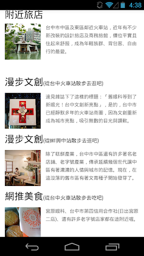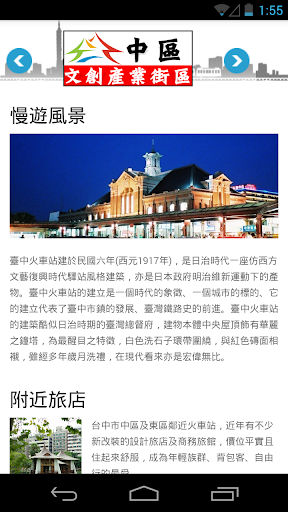 台中市政府將整個大台中(包括舊台中市及台中縣)訂出十大文創街區,這個APP將幾個最有特色街區的文創店家、新改裝的設計旅店及商務旅館、文化資產景點故事...等資訊陸續收錄進來。在尚未收錄完整資訊前的版本是做為開放測試使用,歡迎提供我們改善建議,謝謝!