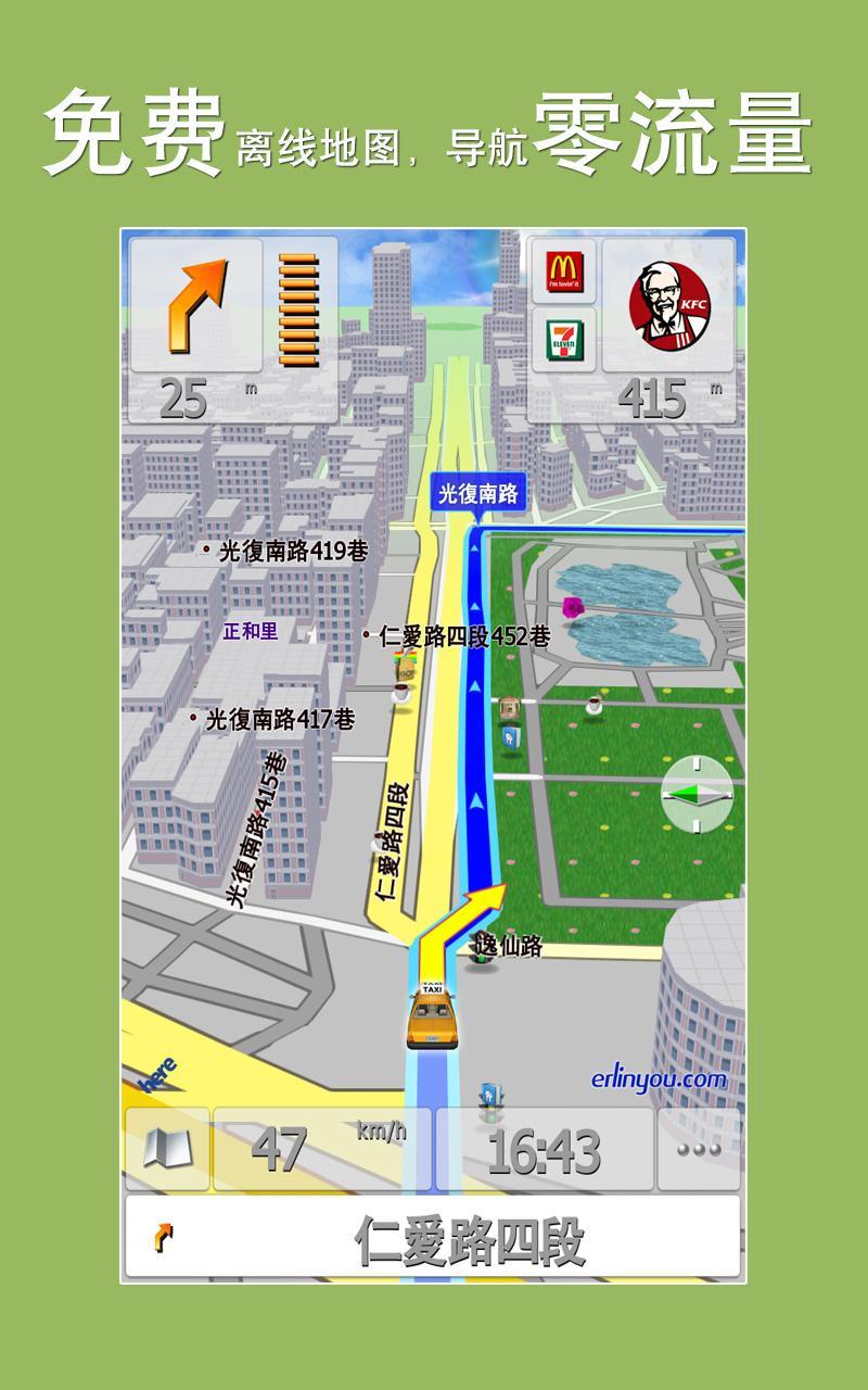 erlinyou旅图台湾导航地图——采用世界排名第一的here地图数据,零流量、纯离线地图免费下载。erlinyou旅图导航地图是7次F1世界冠军舒马赫力荐,精彩旅图公司精心打造的境外出行导航解决方案。拥有最强大的地址搜索、最准确的路径计算、最精准的路径指引,最漂亮的二维、三维地图和最直观的操作界面。境外吃喝玩乐,只用中文便可一网打尽,让您国际旅程畅行无忧!1.采用世界排名第一的here地图数据,在华独家授权erlinyou旅图使用;2.用中文畅游世界;3.境外游贴身宝典:erlinyou旅图为您精心打造热门城市、热门景点、热门饮食、热门购物中心等吃、穿、住、行推荐列表;4.精美实景城市视觉体验,真实打造标志性建筑及三维楼宇直观视觉感受;5.丰富地理信息展现:公园、森林、高尔夫球场、机场等让您一目了然;6.独创境外街道门牌号搜索,实现门对门无缝导航衔接;7.地点名称、品牌名称、周边POI兴趣点一键搜索;8.全新布局、人性化UI交互体验、使用更高效;9.支持汽车、自行车、行人导航模式。