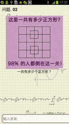 《史上最难题目》算是一款冒险解谜类的游戏,这款游戏的唯一目标就是解决一道又一道挑战人类智商极限的题目.有些是找规律,就像高中的某些数学题;有些是考眼力,眼花缭乱.既然这游戏名字都这么霸气,敢挑战就要做好心理准备哦!