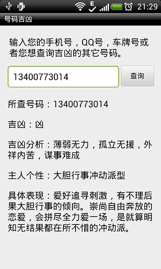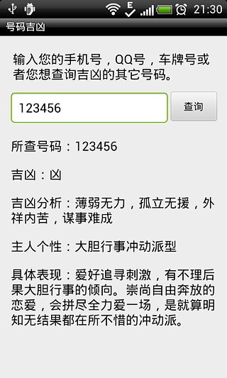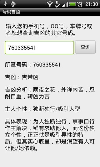 可手机号码测吉凶、固定电话号码测吉凶、小灵通测吉凶、QQ号码测吉凶、身份证等任意号码吉凶测试查询以及号码主人的性格分析。