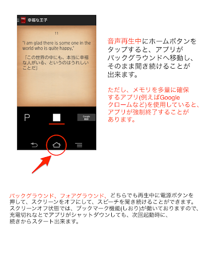 ②アプリをバックグラウンドで再生(スクリーンオフの状態でも物語の最後まで連続再生)