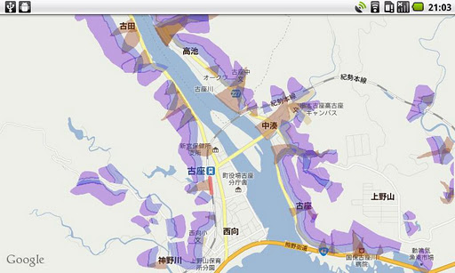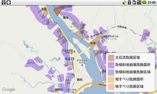 メニューから凡例表示・非表示の切り換えが可能です。また表示された領域をタップすると危険箇所区分が表示されます。区分は以下のようになっています。