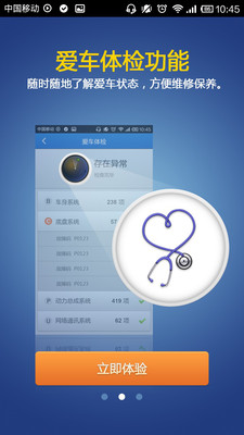 爱车体检:获取爱车实时的车身、底盘、动力总成、网络通讯系统等故障详情,车主随时知晓爱车状况。