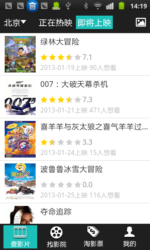 爱电影的人伤不起啊!现在好了,团800电影票来了!!一个APP解决8大看电影难题提供全国各大城市近200家主流电影院折扣电影票、可手机直接购买、支持在线选座、省去排队烦恼、LBS定位周边影院信息,更有地图模式,影院是远是近一目了然!