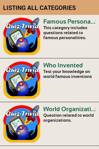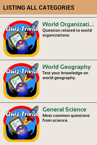 测验类别的一个单一的应用程序的集合。更多的问题和类别每天都会增加。每次你做个小测验,你会得到每日更新的问题新集。我们有超过1000测验包含在每个类别。