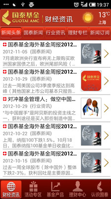 国泰基金是中国首批批准成立,行业内极少数拥有“全牌照”业务资格的基金管理公司之一,资产管理产品线丰富,具有国际化视野。本软件是国泰基金公司为金融投资者提供的专业基金学习及投资资讯平台,免费提供投资者全方位的金融行业、基金、行情咨询以及基金账户理财信息。同时提供了天气、航班、银行网点等实用功能。