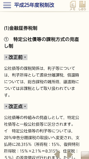 ②もう1つの使い方として、平成25年度税制改正の内容をピックアップして、一覧で概要を掲げ(第1章)、個別の解説と関連リンクを提供しています(第2章)。国税庁HPを使い込んでいるので、ナビはいらないという方も、こちらの使い方で、本アプリが重宝するはずです。
