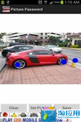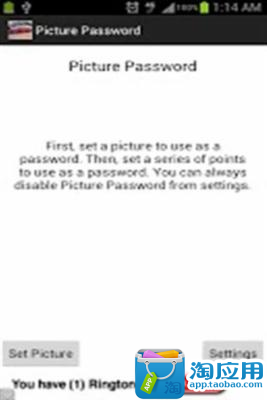 有了它,你可以把你的一个数以百万计的图片,提醒你的随机的东西,只需使用一个密码。步骤:1。选择一个图片。2。选择一些点,你想使用作为密码3。保存4。摇动电话5。SHAZAMM,你现在有一个图片密码。每次你打开你的电话,你应该看到一个图片。进入点和提交!