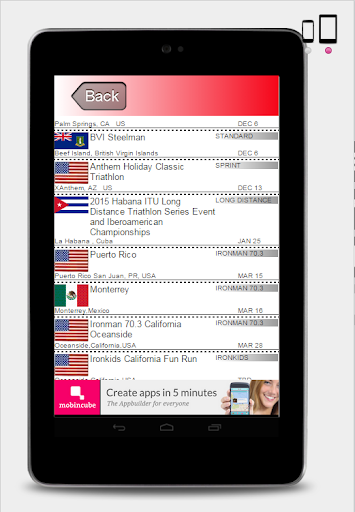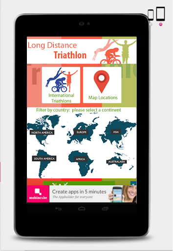 這是一個應用程序,收集最重要的國際鐵人三項賽系列如:鐵人,鐵人70.3,世界鐵人三項系列,鐵人三項世界杯,5i50,的Xterra,CAMTRI,半,衝刺鐵人三項比賽,超級衝刺鐵人三項,Ironkids,鐵姑娘,多的體育節日,一些鐵人兩項,其他人之間的帕拉鐵人三項