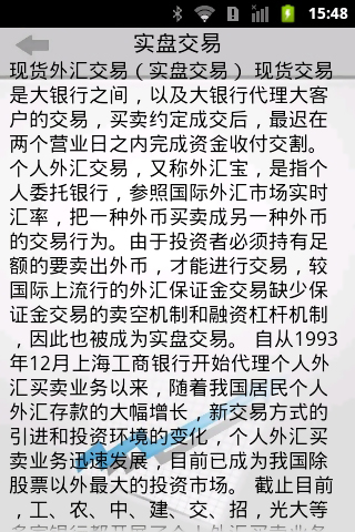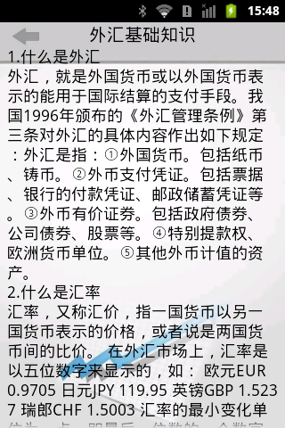 外汇投资入门,这是一款简单易懂的外汇投资入门类手机应用,小小的外汇投资中,蕴含着大智慧的。在应用中我们详细描述了外汇的基本概念,世界主要的外汇市场,外汇交易和汇率,同时我们分析了美元、英镑、欧元、日元、加元等世界主要货币的特征和影响因素。非常适合年轻人看的投资理财应用。完全免费的,赶快下下来看看吧。