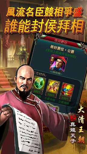 这是一个集名臣收集、布阵策略、后宫晋升、孩子养成、联盟建设、奇珍异宝种植等玩法于一体的RPG游戏。数百年前,江湖混乱,朝堂内斗,乱世战火起,必有英雄出,谁能御龙天下,扭转乾坤?谁是大清王朝的真龙天子,威震天下?没错,就是你!