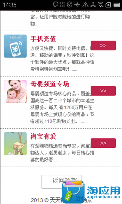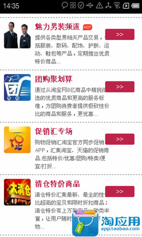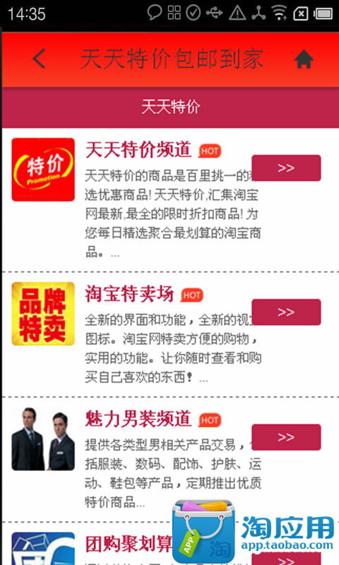 天天特价包邮到家是聚合淘宝网8亿商品中精挑细选的优质商品和更高的服务标准,商家的特价促销打折商品总汇到的手机应用,通过为消费者提供极致性价比的商品和服务汇集淘宝网最新,最全的限时折扣商品!全新的界面和功能,全新的视觉图标淘宝网特卖方便的购物,实用的功能每天提供的品类包括女装,男装,男鞋,母婴等核心类目商品,覆盖全国高达一百二十个城市的本地生活服务,定期推出优质特价商品,更有天天特价的商品,百里挑一的精选优惠商品! 天天特价包邮到家与淘宝官方同步,汇集淘宝、天猫的促销商品,包括特价/优惠/折扣/尾货/断码/清仓/限时/限量/抢购/秒杀/团购/特卖/便宜/打折等各类促销信息,每日优惠商品信息自动更新,再也不用翻遍淘宝,是消费者省钱网购的第一选择让你随时查看和购买自己喜欢的东西!...