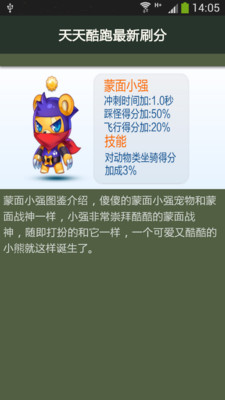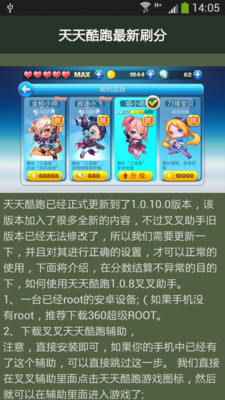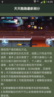 天天酷跑首次推出一个全新的版本,新版将有大量新角色、新坐骑、新宠物以及全新玩法模式。新增的极速世界玩的不适应?不知道如何刷分?看到好友几十万分在你头上耀武扬威你还能淡定得了?本软件针对最新版本给玩家多种刷分技巧!