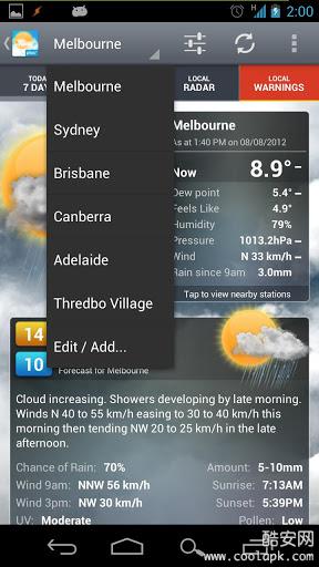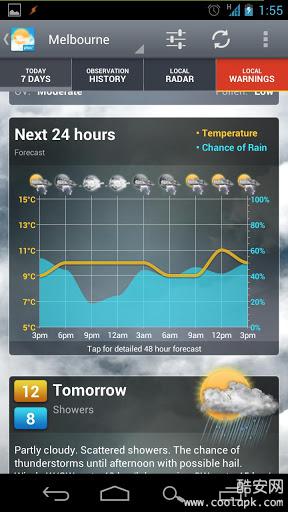 Weatherzone Plus是一款天气预报软件,可以预报固定区域就能够得到对应的天气信息,包含7天天气、过去24小时天气、本地卫星云图和天气报警等功能。还可告诉你之后的气温走势和降雨概率。