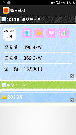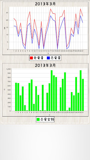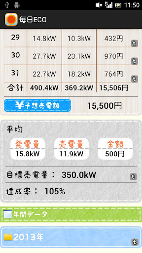また、日の平均がわかる機能と過去の発電量・売電量・売電金額が記録される機能があるので年間・月間で比較することができます。