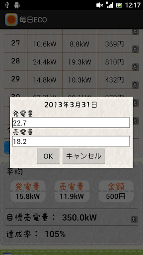 毎日の発電量・余剰電力を入力するだけで日の売電金額はもちろん、月間の予想売電金額がわかります。