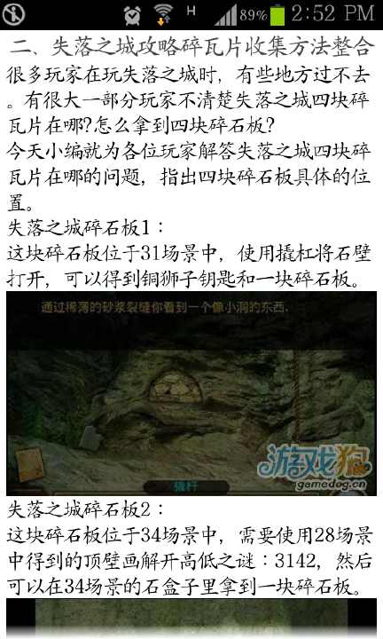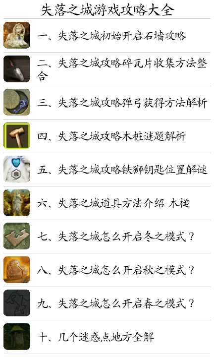 包含了各个关节的难点部分,有图有文字!《失落之城》是目前火的一款热门解密类游戏,游戏不仅在画面上有着不俗的表现,在内容上也十分的丰富,包含了各式各样的道具,游戏难度也比较复杂,需要不停的动脑才能够顺利过关,当然你对事物的观察能力也是一大重点。