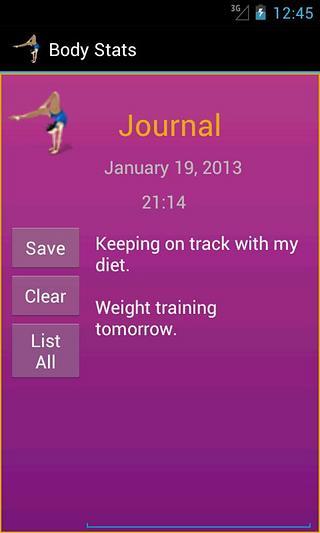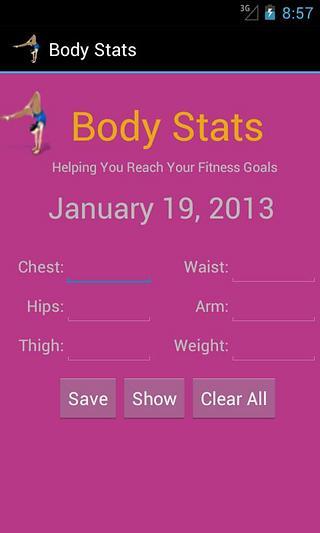 EuroDroid.com lists Body Stats as *GOOD APP *! Track your health & fitness progress.Use the Journal for food, training,etc.Not a BMI calculator.Chinese translation (Traditional and Simplified) by http://goapk.comInstall to SD CardFEATURES:- Save measurements & view history- Find gyms - Motivation links- Journal...