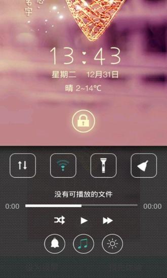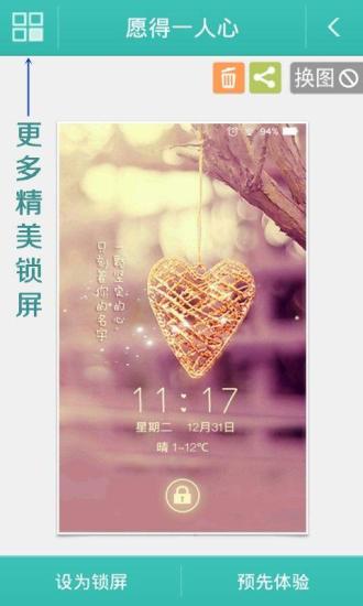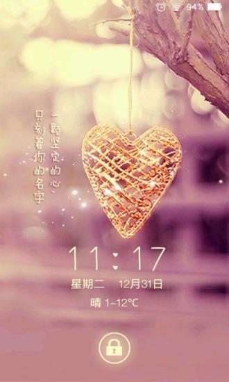 只愿得一人心,白首不分离,一款浪漫简约爱情锁屏,是每个人对爱情的憧憬与向往,一款非常浪漫的锁屏,解锁方法:只需按住中间的滑块向左滑动即可解锁,向右滑动即可打开短信,在锁屏的右上方有个箭头的图示,点击它即可获得更多的设置,有数字密码解锁,九宫格解锁,还有天气设置只要点击城市设置,搜索城市就可成功获取当地的天气状况,还有点击左上角的四个小方框形状的,里面有许多的精品网络资源锁屏,喜欢的快来试试吧!新增功能,按住锁屏界面的空白处(空白处是指不是滑块的解锁区域)往上滑动,就可直接打开音乐播放器哦等快捷功能!6 设为锁屏后能读取联系人数据,和读取短信,和定位当地天气的功能。