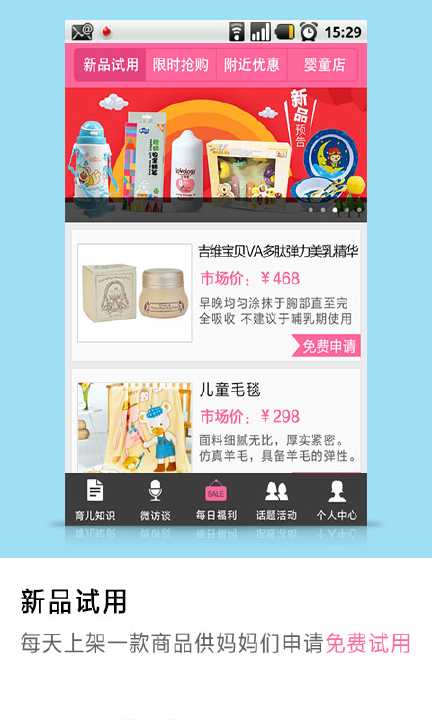 1,每天推出一款母婴类商品,可免费申请试用