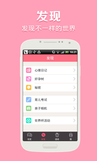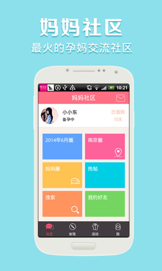 妈妈社区-备孕、怀孕、育儿必备。每天和170万妈妈在线交流,现在下载即可获得专属礼包,每月5000份。【社区】育儿交流、母乳喂养、8090后妈妈、手工DIY制作、宝宝秀场、麻辣婆媳、美食厨房、十月怀胎...准妈妈辣妈妈们尽情的交流吧。【活动】动动手指,奖品轻松到手,免费大礼送不停。【百宝箱】胎儿体重计算器、胎动计数...各种实用小工具等您去发现。【心情日记】记录生活中的点点滴滴。【秘密】不方便在社区直接交流的内容就来这里吧,这里是您的私密交流空间。【育儿考试】备孕、怀孕、育儿这方面的知识您准备充分了吗,快来测试一下吧。【亲子相机】记录宝宝的成长经历,留下珍贵的记忆。【趣味测试】打发闲暇时光,纯属娱乐,不可当真哦。加入妈妈社区吧!在此相遇,找到各种志趣相投的姐妹,共同分享怀孕和育儿期的经验与问题,聊聊情感八卦!从此相识,一起聊孩子,聊老公,聊婆媳,还能聊聊扮靓美容减肥心得。妈妈社区——爱,一直都在!客服QQ:2355603193