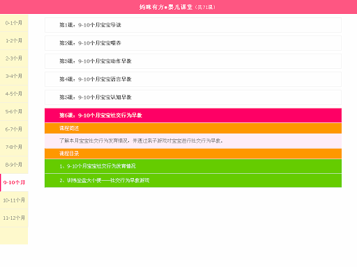 0-1岁婴儿全程指导课程,每月6课。课程内容:每月宝宝发育要点、养育要点、喂养课、动作早教课、语言早教课、认知早教课、社交行为早教课。