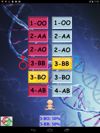 你需要选择母亲及父亲从类型六种已知血型的血液: