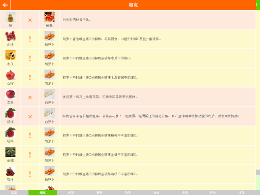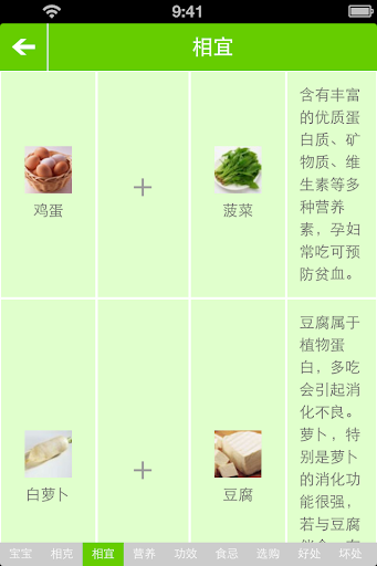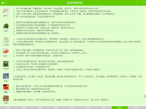 常见食物中,能吃什么、不能吃什么、吃的好处坏处、食物相克相宜、营养功效、购买注意事项等。应用支持10种食物同时查询,轻轻松松就可知道什么不能同食,同时内分通用版、孕妇版、产妇版、宝宝版,是妈咪的育儿必备工具。