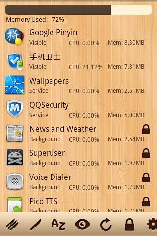 Wood Task Manager can monitor and kill processes running on your system. It can be used to free memory used, save battery and speed up your phone & tablet. It display information about processes: process type, cpu usage and memory usage. Features:*Viewing the processes running on your system*Viewing real-time CPU usage of each running process*Viewing real-time Memory usage of each running process*Viewing process type *Viewing process details info*View phone & tablet memory usage*View running services*Touch "refresh" button to Real-time data*Sort by Name, Type, CPU usage, Memory usage and Whether locked*lock & unlock process to protect from killing*Kill process selected*Kill all unlocked processes by one touching Wish it help:) KW: task killer taskiller taskmanager systempanel app process cleaner manager panel ATK memory clear systempanel android assistant