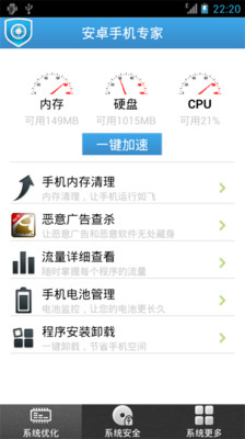 安卓手机专家是一款基于安卓平台的免费管理软件;主要功能有电池优化,内存清理,流量监控,任何程序保护--安装卸载,任何文件数据加密,电常用电话号码查询,手机配置查看管理等功能,是您手机优化管理的首选.