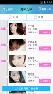 4.想一睹女神(男神)的芳容,与女神(男神)亲密互动?男神女神可以查看或者上传自己心仪的男神女神,并可以通过点赞把自己的男神女神送到校花校草的位置!