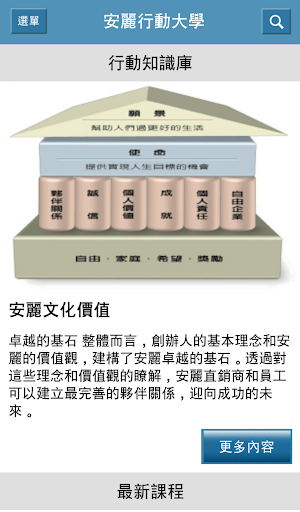 學習,是成長的力量,更是成功必要的關鍵,「安麗行動大學」的成立正是為了幫助積極發展的安麗夥伴們,利用每天許多原本可能被浪費掉的片段時間,隨時學習、處處成長;透過豐富的事業、產品知識、職能發展…等四大學院輕學習課程,以及許多國內外名師、成功領導人的經驗分享,不僅能為您的安麗事業發展增加能力與動力,更能結合公司的各項培訓課程及各團隊中心、教室的多元學習,助您加速邁向成功。