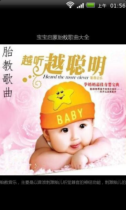 胎教音乐,主要是以音波刺激胎儿听觉器官的神经功能,刺激胎儿的脑部成长孕8个月后反复播送一首固定的乐曲,可为出生后的孩子培养音乐爱好,并为开发孩子的想象力打下基础专家研究胎教音乐对以后孩子的语言和音乐方面的培训至关重要,作为准宝宝或者准爸爸,快来让自己的孩子听听启蒙胎教歌曲,聪明宝宝的梦想起飞,从这里开启!COME ON!