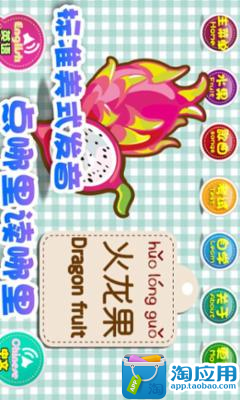 无论你的宝宝是1-2岁的牙牙学语阶段,还是3-4岁已经开始上幼儿园,或者是5-6岁已经有一定的英语基础。这款学英语的工具书都很适合你的小朋友学习英语。35种常用水果, 都是小宝宝日常能见到,能认识的,有苹果,香蕉,哈密瓜,芒果,草莓,水蜜桃等等。